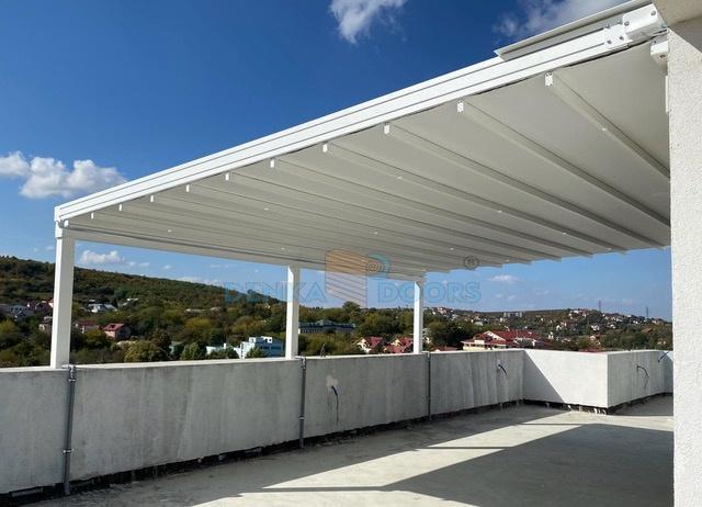 Acoperisul retractabil de la Denka Doors Iasi sau sisteme de acoperis retractabil, sunt solutii pentru suprafete mari, automatizate, cu structura de aluminiu si material de acoperire din polyplan block-out cu insertie de carbon, rezistenta la tractiune mare;